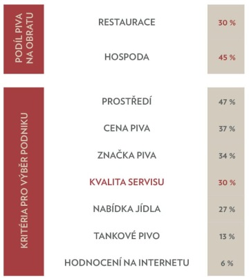 Pivo tvoří významnou část obratu restaurací a hospod. Kvalita jeho servisu je při tom pro zákazníky velice důležitá při výběru provozovny. Pouze 14 % spotřebitelů se drží pouze své jedné provozovny.