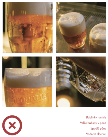 Vždy průběžně kontroluj stav sklenic a poškozené sklenice (prasklé, matné, nebo poškrábané) již dál na pivo nepoužívej. Nepoužívej ani značně znečištěné sklenice (usazeniny na vnější straně dna, v embosovaných grafikách apod.).